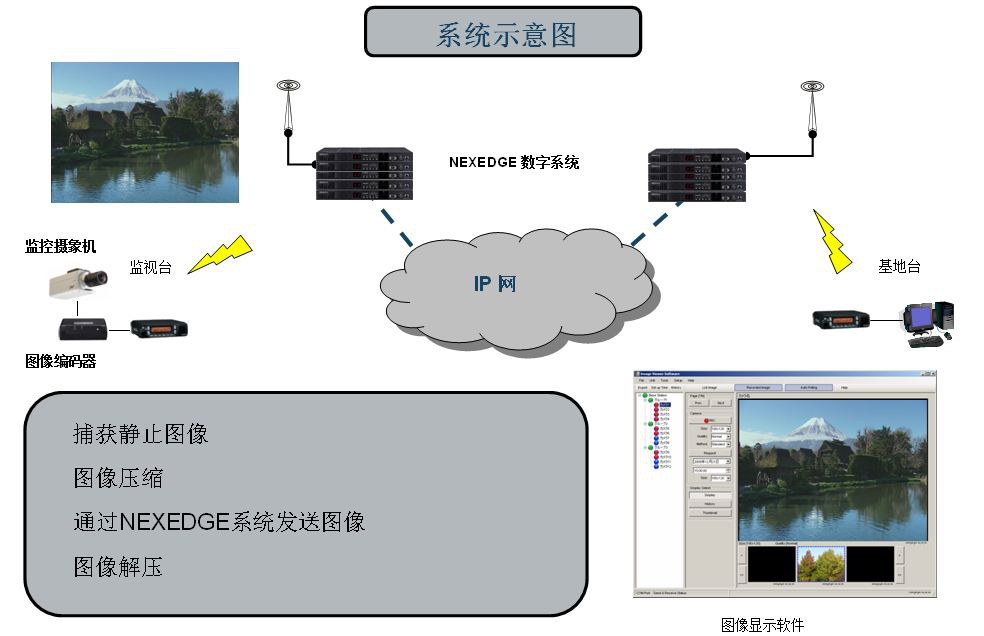 建伍公司数字通讯系统,配合KVT-11图像编码器+KAS-11图像显示软件构成图像传输系统,实现远程监控,示意图如下:
