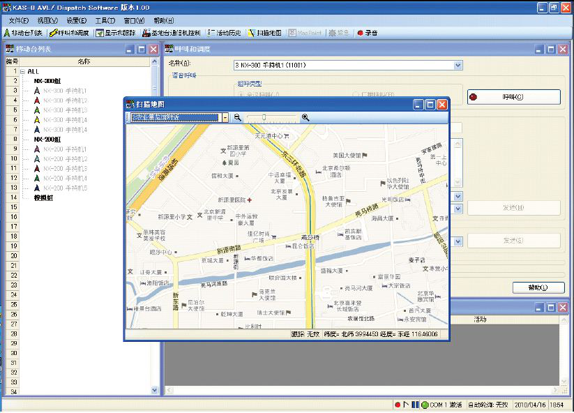 用KENWOOD的NX-800组成调度台,在电脑上安装由建伍公司提供的KAS-8管理软件,可以记录通话双方的身份码、通话时间、录音等参数。还可以对违归规或丢失的移动终端进行遥毙和复活。遥毙可以分为可遥控复活的冻结和不能遥控复活的枪毙(只能重新编程,否则不能使用)。配以电子地图,还可实现GPS位置信息管理。